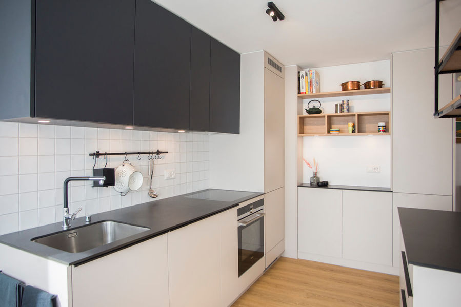 In ihrer ursprünglichen Konfiguration waren Küche und Wohnzimmer getrennt. Die neue Küche wurde umgestaltet und bietet einen offenen Wohnbereich. Beide Räume gewinnen an Volumen und Funktionalität. Die Atmosphäre der Küche wurde in einer warmen Stimmung gestaltet, mit beigefarbenen Fronten, die mit Holznischen kombiniert sind. Die schwarzen Elemente geben dem Ganzen Charakter.