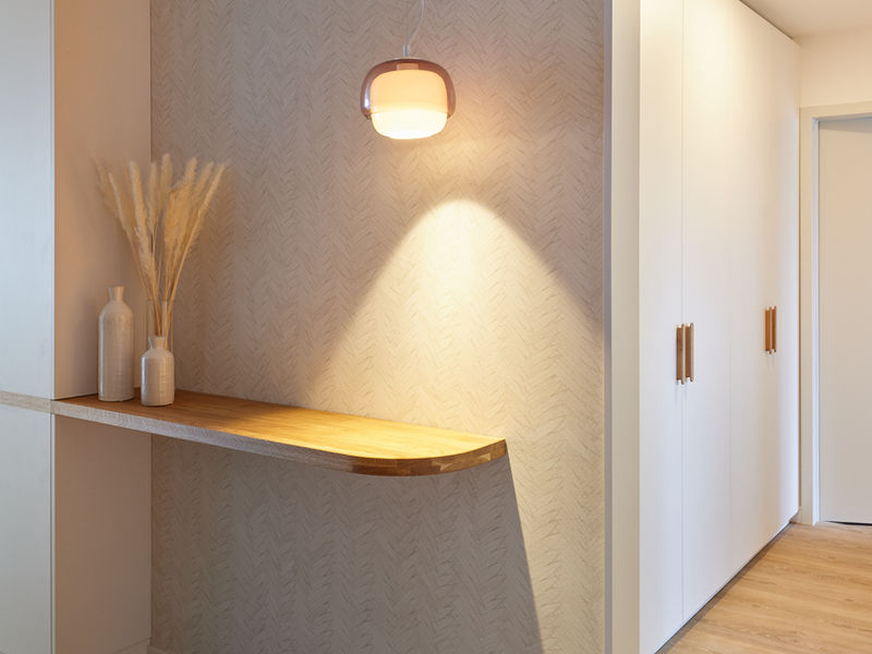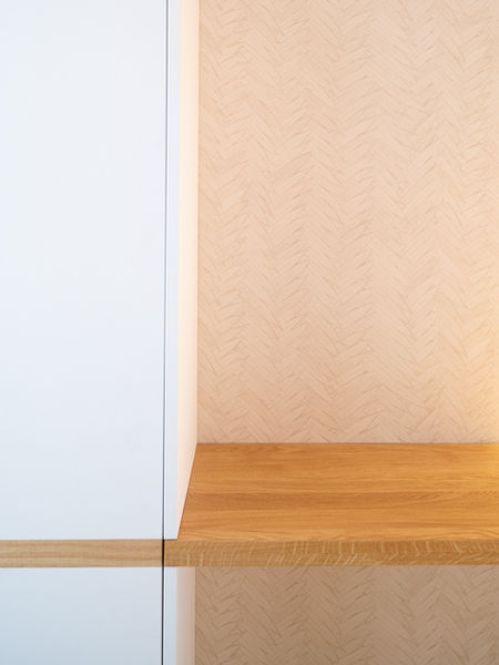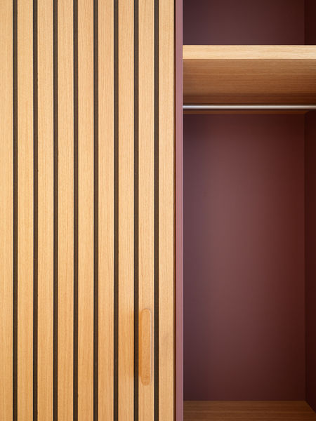 Für die Raumatmosphäre wurde eine Auswahl sanfter Materialien getroffen, um eine helle und gelassene Stimmung zu erzeugen, die durch eine naturinspirierte Tapete unterstrichen wird. Diese Ruhe wird durch einen Akzent in Weinrot veredelt, der Charakter und Eleganz verleiht – eine Sophistication, die durch die Holzlamellen der Garderobentür noch betont wird.