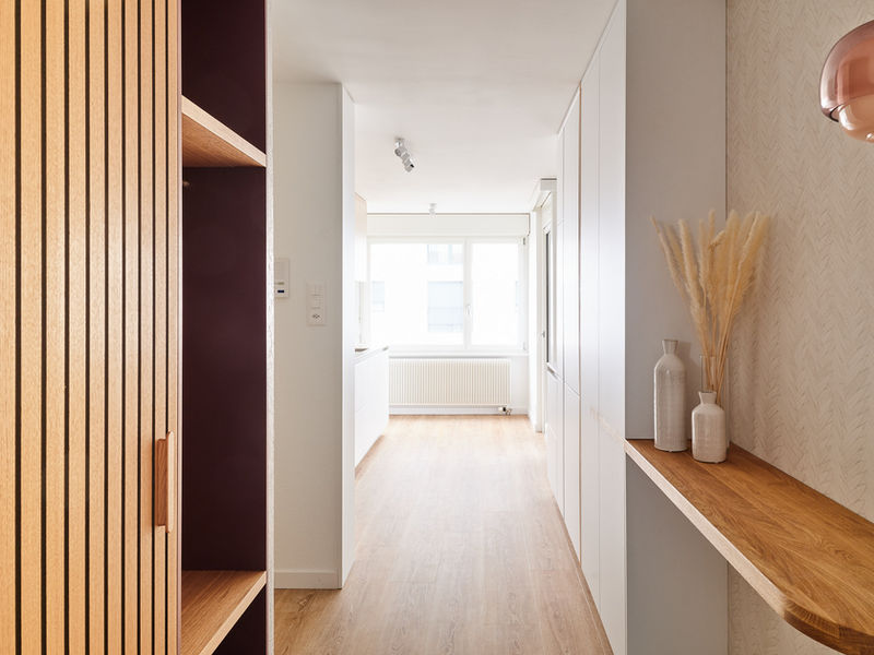 Der Eingangsbereich wurde vollständig neu gestaltet, um die Bewegungsabläufe und den Komfort zu optimieren. Durch die Aufhebung des direkten Durchgangs vom Eingang zum Wohnzimmer konnte eine Sitzbank im Wohnbereich integriert werden. Dies schafft zusätzlichen Platz für Möbel und bietet gleichzeitig großzügige Stauräume.