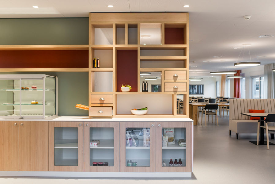 Kosm Sàrl a développé le concept couleurs, matériaux et éclairage. La contrainte résidait à choisir des matériaux adaptés au domaine médical et particulièrement aux personnes âgées. Entre autres sont importantes les questions de contraste couleur, de propriété anti-dérapante ou de résistance aux produits chimiques et organiques. L’éclairage doit être planifié avec soin afin d’apporter une lumière uniforme et chaleureuse et afin d’éviter l’éblouissement.